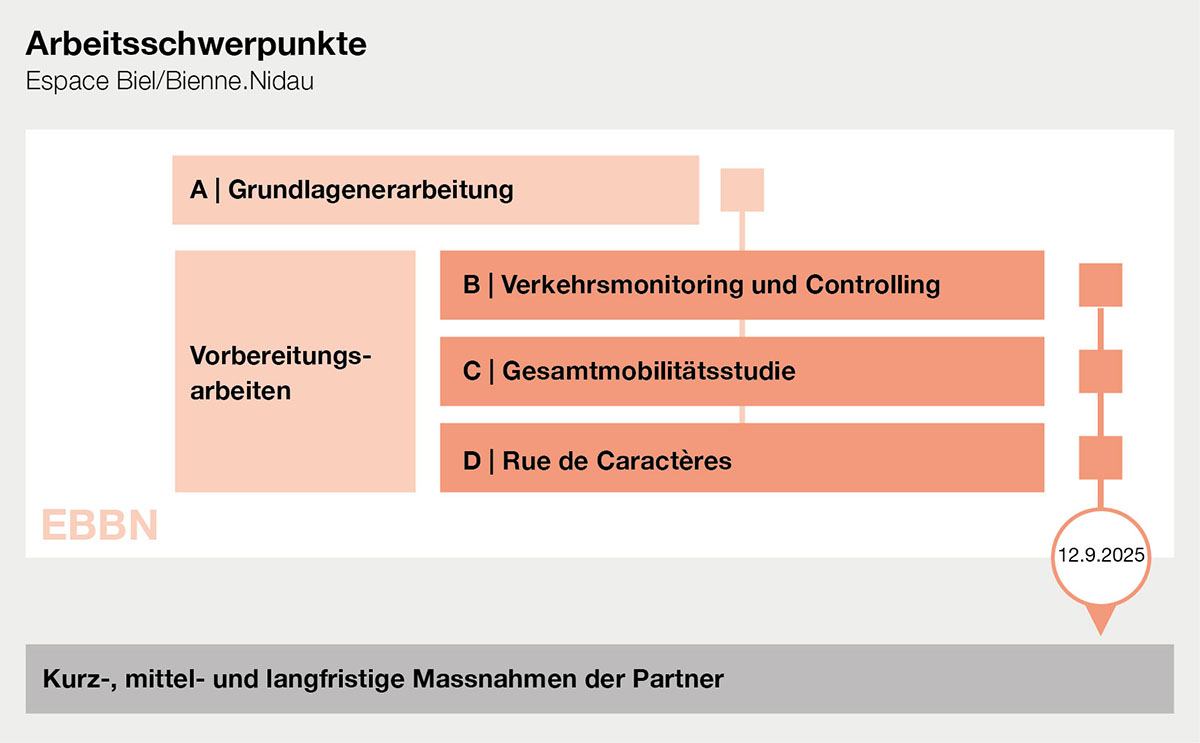 Die Aufgabe von EBBN bestand darin, die vielfältigen Empfehlungen und Ideen aus dem Schlussbericht der Dialoggruppe zum Westast zu prüfen, zu triagieren und zu priorisieren sowie wichtige gesamtverkehrliche Grundlagen zu erarbeiten. Gesteuert wurde EBBN durch eine Behördendelegation unter der Leitung des Bieler Stadtpräsidiums. Eine Projektkommission, bestehend aus leitenden Vertreterinnen und Vertreter der Verwaltung und begleitet von einer externen Projektkoordination, führte die Arbeiten operativ. Unterstützt wurde die Projektkommission von Fachexperten aus den Bereichen Kommunikation, Verkehr und Städtebau. Am 12. September 2025 wurden die Arbeiten nach intensiver regional bedeutender Abklärungen offiziell beendet. Besonders wichtig war dabei auch der Einbezug der Vertreterinnen und Vertreter aus Wirtschaft, Verkehr und Umwelt sowie Bürgergruppierungen, die in Forums-Veranstaltungen regelmässig informiert und in die Diskussionen einbezogen wurden. Auch die Bevölkerung hatte mehrmals Gelegenheit, sich in Mitwirkungen vor Ort und online einzubringen.