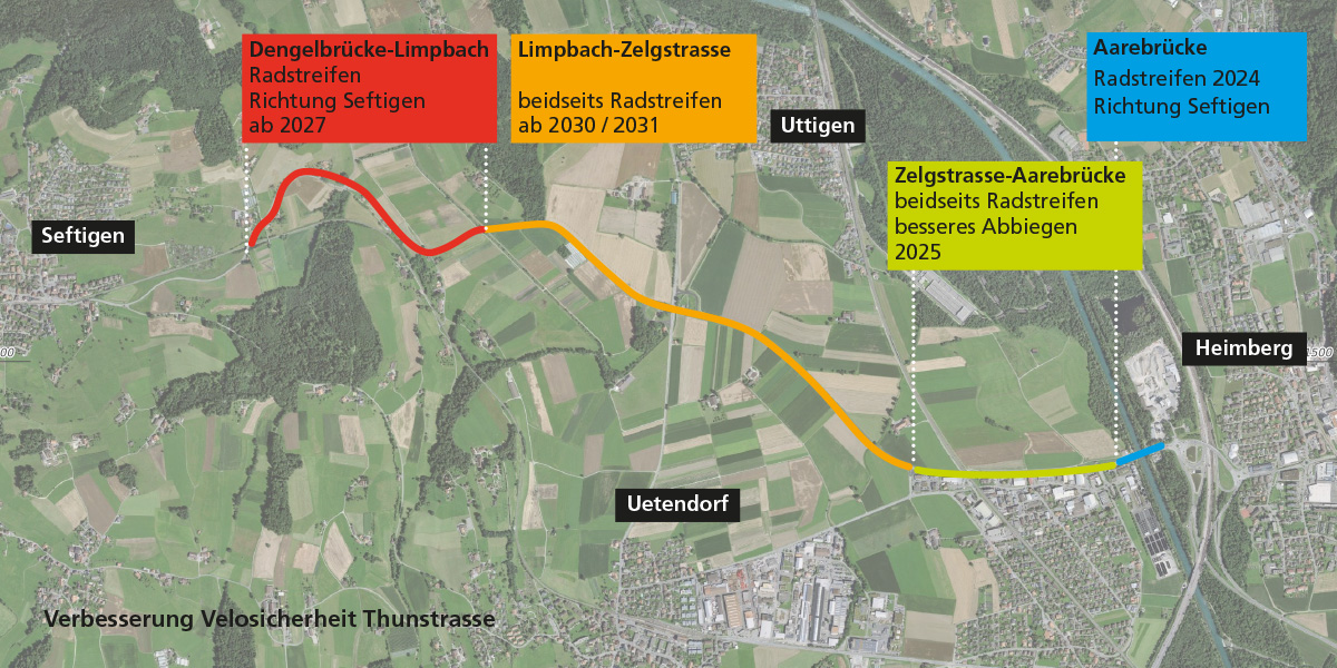 Ein erstes wichtiges Teilprojekt, die sanierungsbedürftige Aarebrücke, wurde bereits instand gesetzt und erweitert: Hier wurde der Radstreifen auf der Brücke zwischen Uetendorf und Heimberg ausgebaut. Durch den Anbau eines neuen Velostegs konnte die gesamte Brückenbreite vergrössert werden. In Kombination mit dem Geh- und Radweg auf der gegenüberliegenden Seite erhöht sich dadurch die Sicherheit für den Veloverkehr deutlich.