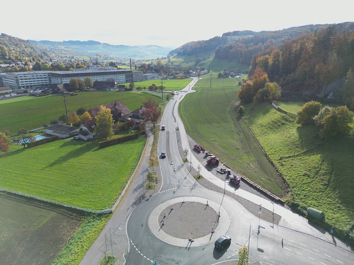 Neben den baulichen Massnahmen wurde auch die Begrünung sorgfältig geplant und umgesetzt. Die Bevölkerung freut sich über die neu gepflanzten Bäume, vor allem beim Kreisel Stützli. Der Grünstreifen zwischen Fahrbahn und Güterweg wird mit einer artenreichen Naturwiesenmischung angesät, die ein naturnahes Umfeld schafft.