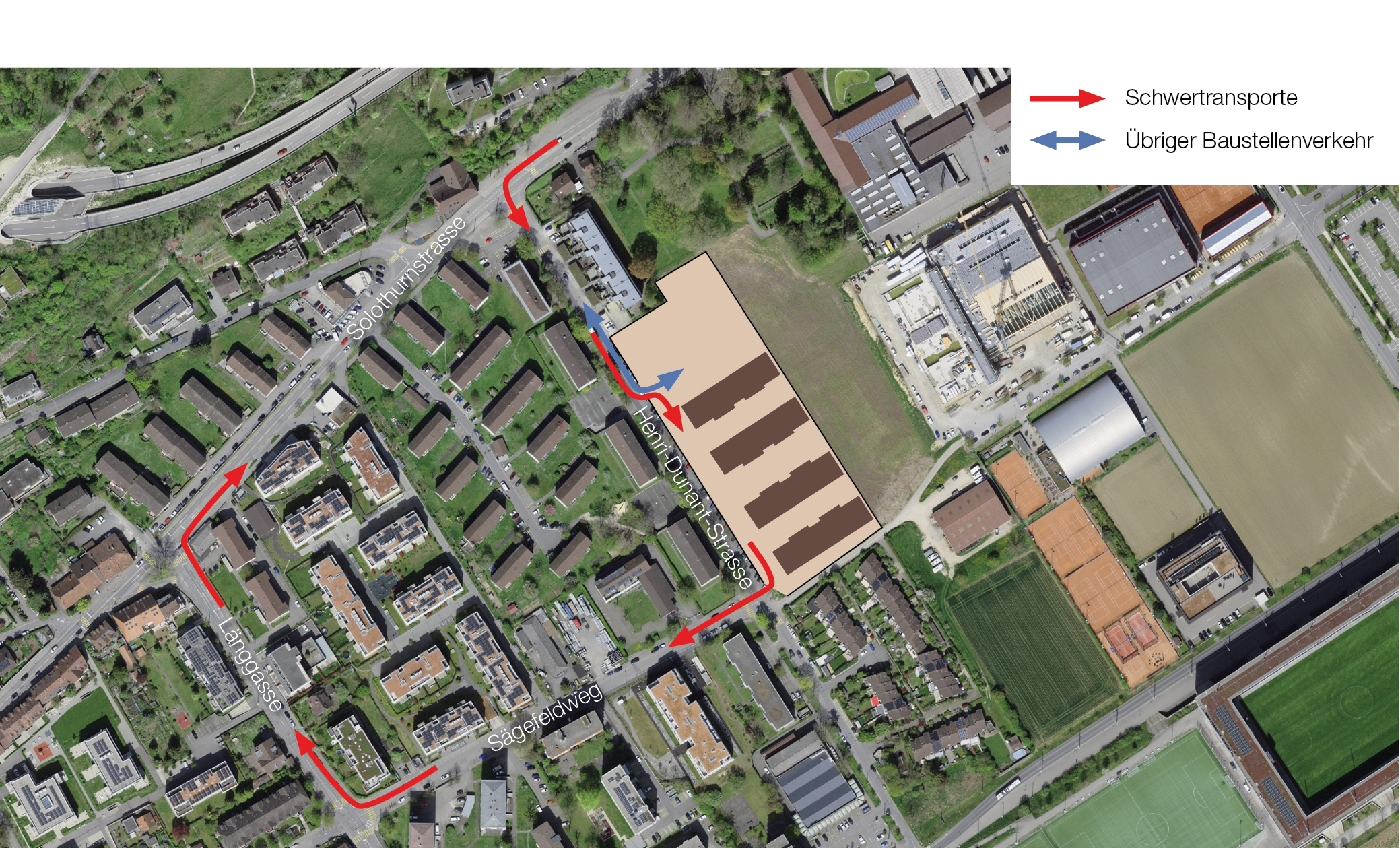 Schwertransporte erreichen die Baustelle via Solothurnstrasse. Die Baustellenzufahrt befindet sich auf der Höhe der Henri-Dunant-Strasse 10. Von der Baustelle weg fahren die grossen Lastwagen via Sägefeldweg und Länggasse.