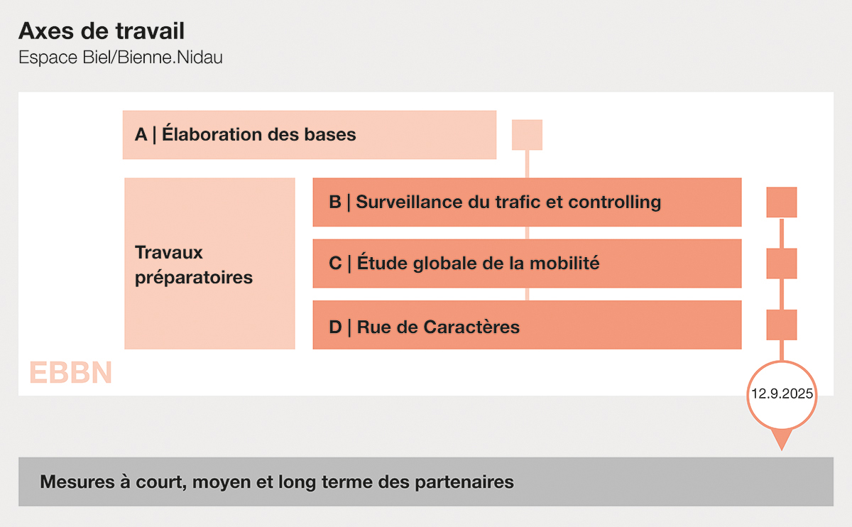 Parmi les autres tâches centrales d’EBBN figuraient également de vastes relevés de trafic ainsi que la mise en place d’un système de monitoring et de contrôle ayant pour but de documenter l’efficacité de mesures ultérieures. Un concours, auquel quatre équipes ont participé, a en outre été lancé pour la revitalisation et le réaménagement de l’axe Route de Berne–Rue d’Aarberg–Rue du Débarcadère–Faubourg du Lac (projet « Rue de Caractères », voir encadré).