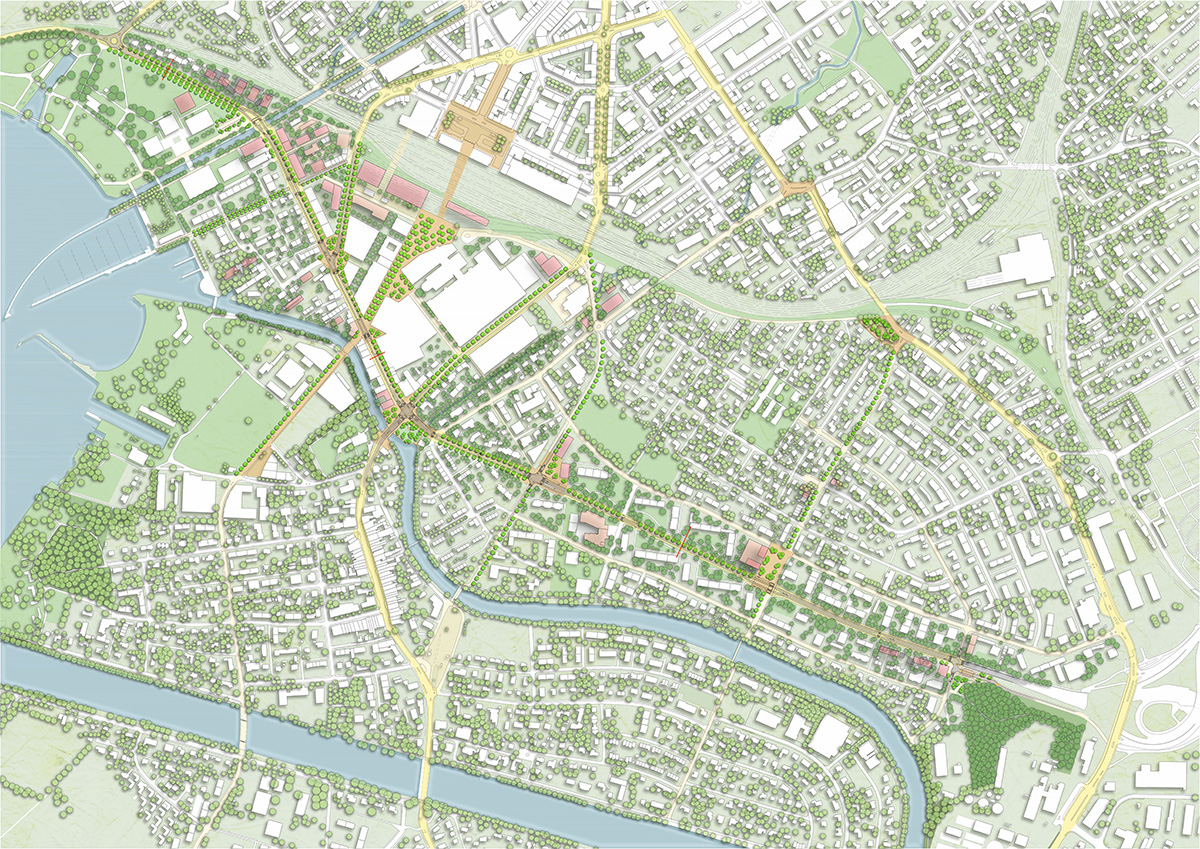 Parmi les quatre contributions au concours, le comité d’évaluation a retenu le projet « Phoenix », une proposition alliant espace routier et qualité de vie, avec de nouveaux passages reliant les quartiers et des bandes multifonctionnelles en milieu de chaussée qui ralentissent le trafic et accueillent des espaces végétalisés. Une gestion coordonnée du trafic est en outre nécessaire pour assurer un développement durable de la mobilité.