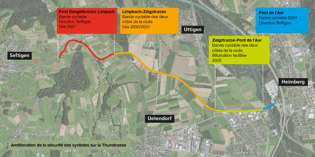 Les travaux relatifs aux deux premières étapes étaient techniquement complexes et très exigeants. « Grâce à la coopération étroite et constructive de toutes les parties impliquées, du maître d’ouvrage à l’entrepreneur et au contremaître en passant par la direction des travaux, les deux premières étapes ont pu être mises en œuvre de manière efficace avec une approche axée sur les solutions », explique Christian Schöni, chef de projet Construction des routes à l’AIC I. La Thunstrasse entre Uetendorf et Seftigen sera aménagée ces prochaines années dans le cadre de deux autres étapes afin d’améliorer durablement la sécurité pour les cyclistes.