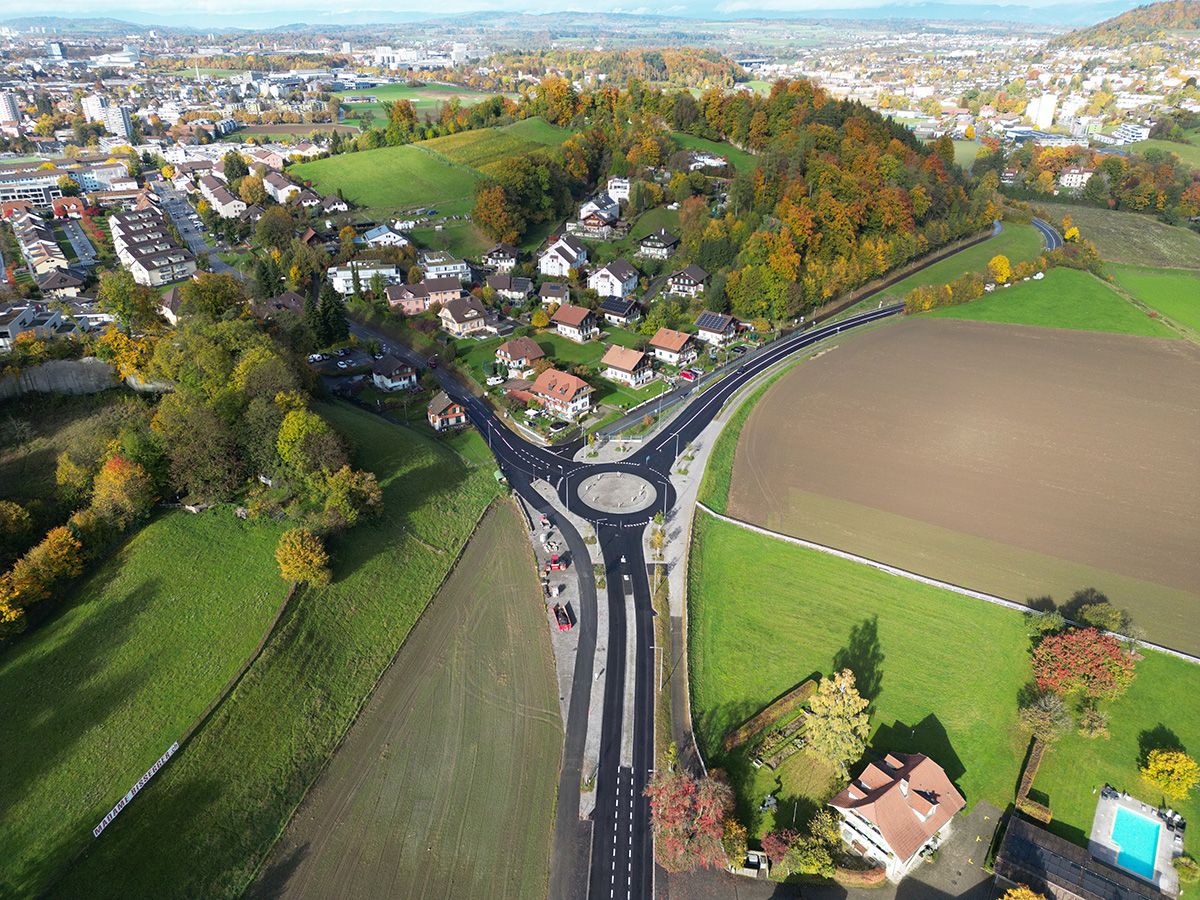 Outre les travaux de construction, la végétalisation a également été planifiée et réalisée de manière minutieuse. La population est heureuse que de nouveaux arbres aient été plantés, notamment au niveau du giratoire du Stützli. Les bandes de verdure entre la chaussée et le chemin agricole ont été ensemencées avec un mélange de graines pour prairie naturelle riche en espèces, ce qui créée un environnement proche de l’état naturel.