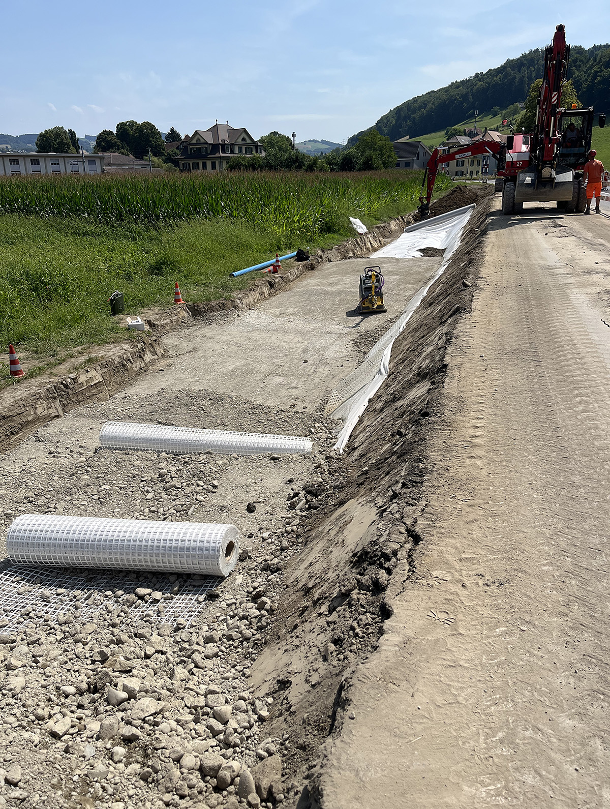 Comme souvent dans ce genre de projets de construction complexes, il a fallu gérer de nombreux aléas. Le début des travaux a par exemple été retardé d’un mois car une indemnité a dû être négociée avec un agriculteur voisin. En outre, les travaux d’élargissement de la chaussée ont révélé que le terrain devait être remplacé et qu’un remblai devait être renforcé afin de garantir la solidité du revêtement. Le remplacement des plaques d’égout rouillées dans le secteur de Bernapark a également pris du temps. Le canal de Mühli y passe juste sous la chaussée.