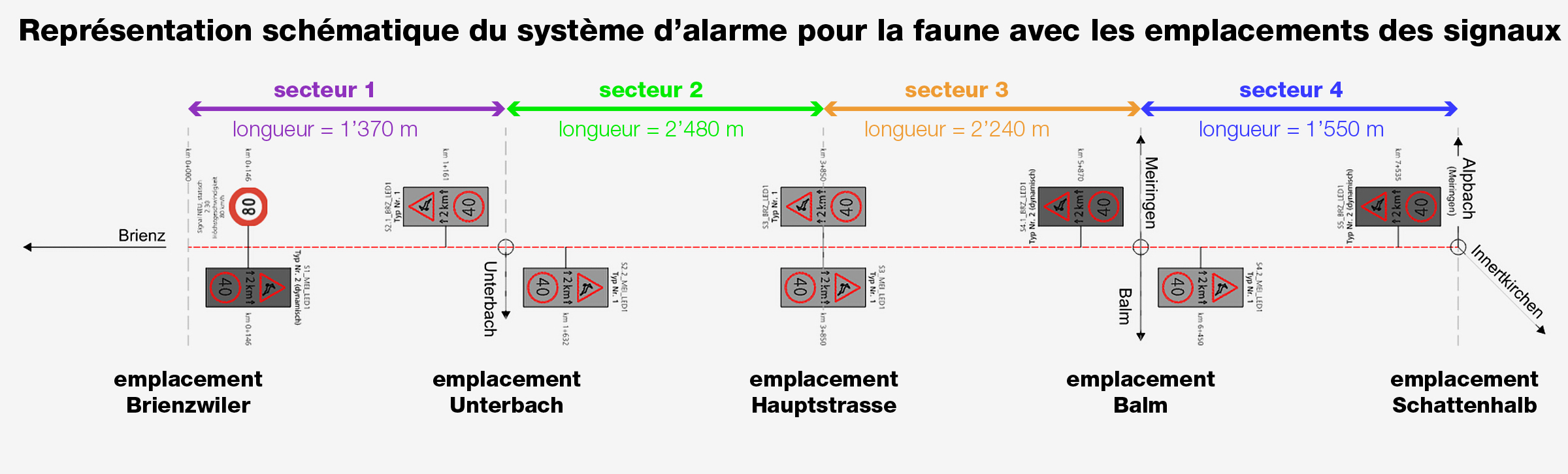 Le premier emplacement choisi pour l’installation du dispositif anti-collision s’est révélé inadéquat. Différents ateliers ont été organisés en 2017 pour évaluer des emplacements plus appropriés. La zone à risque «Mäderen», où la majorité des collisions avec la faune avaient eu lieu, a ainsi été sélectionnée.